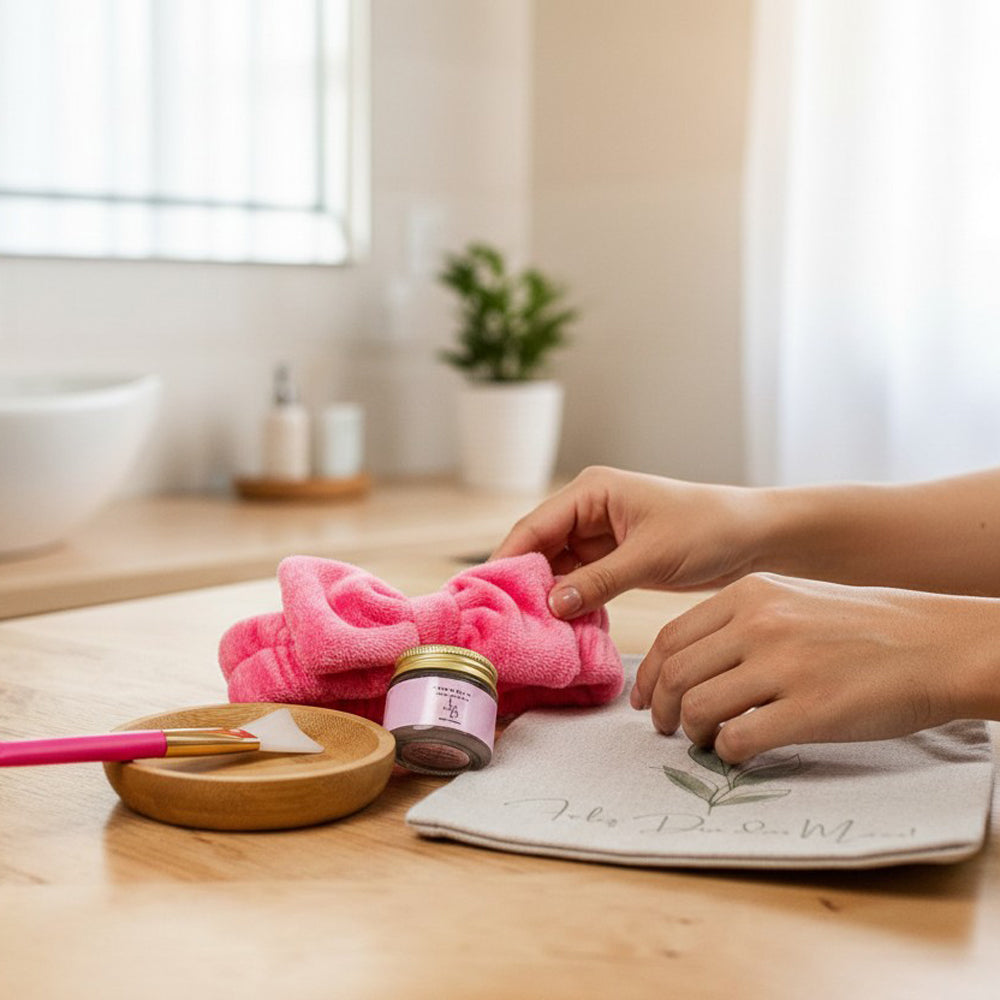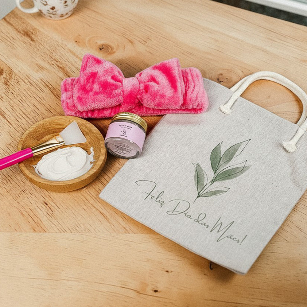 Kit Presente Skin Care com Bag de Linho combina Argila Facial 30g e Faixa de cabelo Pelucia em uma proposta equilibrada, prática e fácil de presentear.